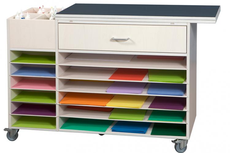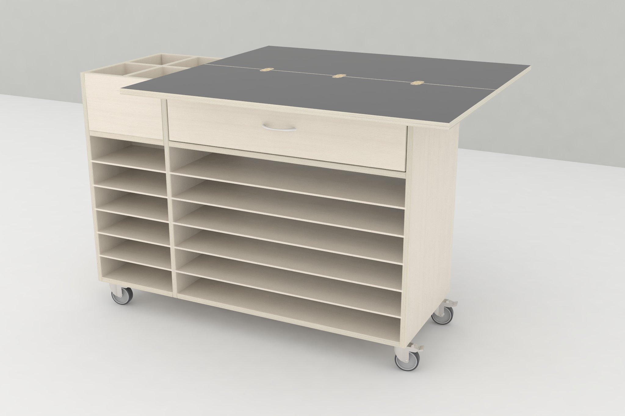 Mobiles Mehrzweckregal/Wagen aus 18 mm weißpigmentiertem Birkensperrholz. Viel Stauraum und ein praktischer, ausklappbarer Arbeitstisch mit anthrazitfarbener Laminatplatte und Schranktür.