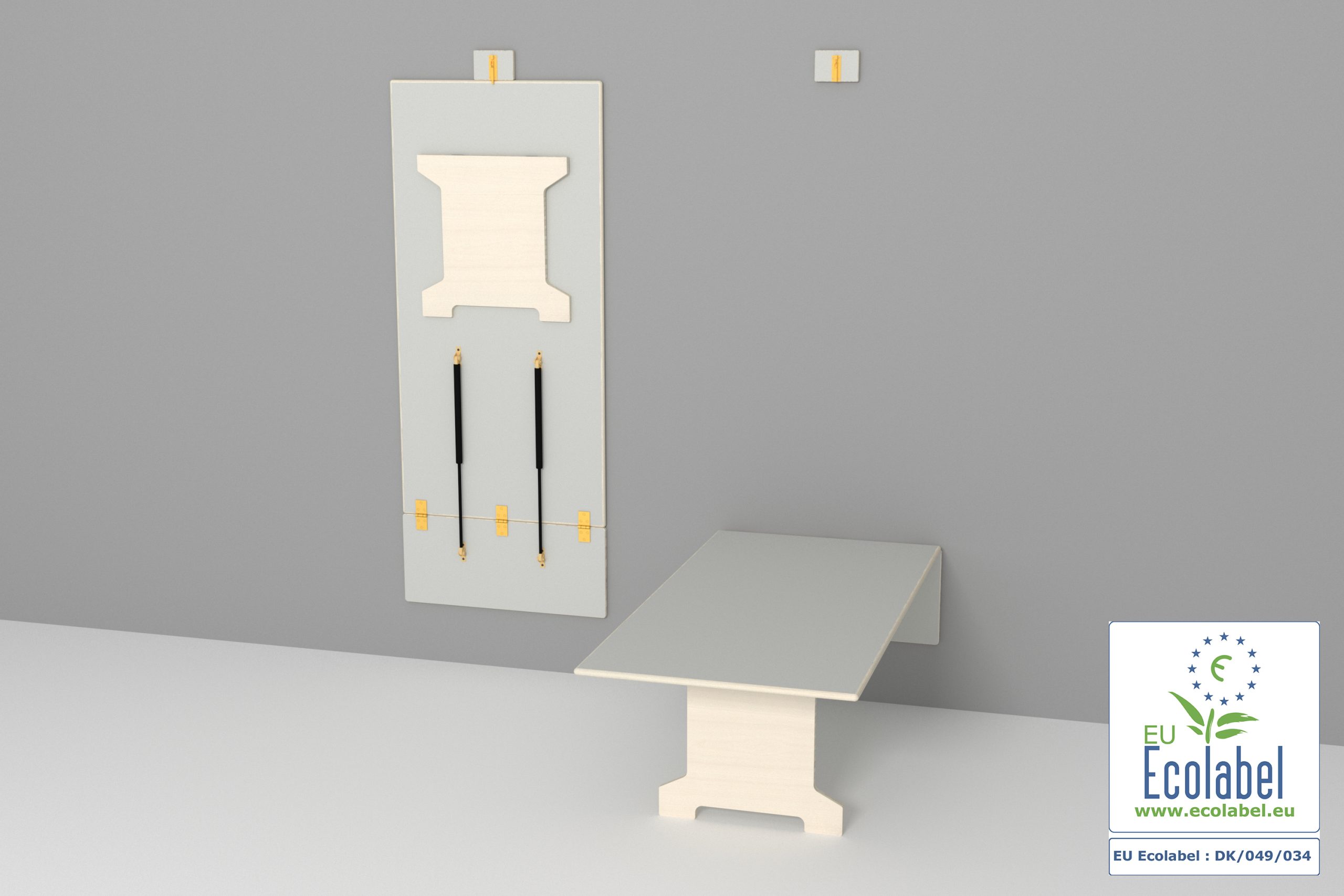 Klapptisch zum Aufhängen an der Wand spart Platz, sodass der Raum zum Spielen und Entwickeln genutzt werden kann.