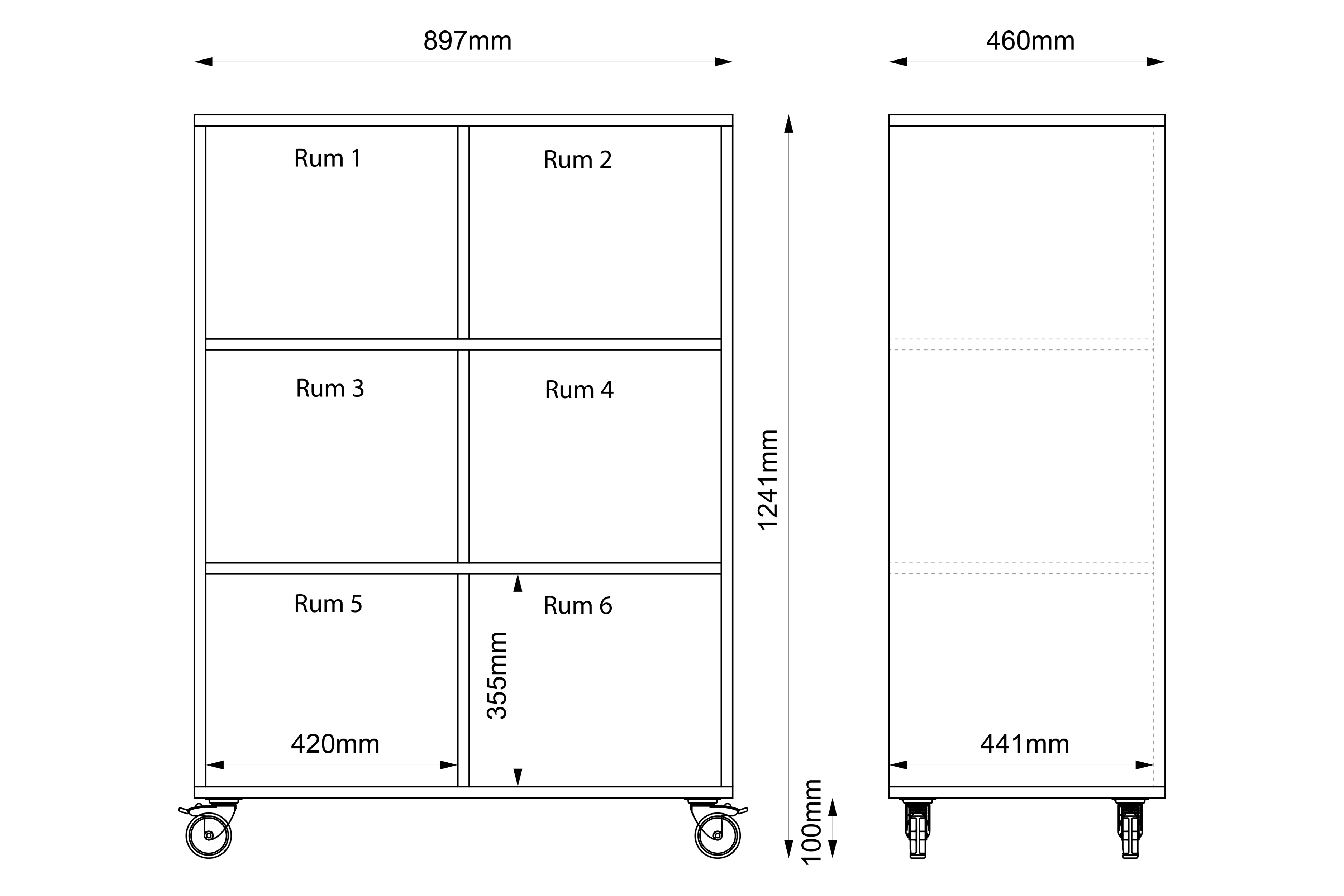 Mobile shelving unit with 6 compartments in 19 mm chipboard.