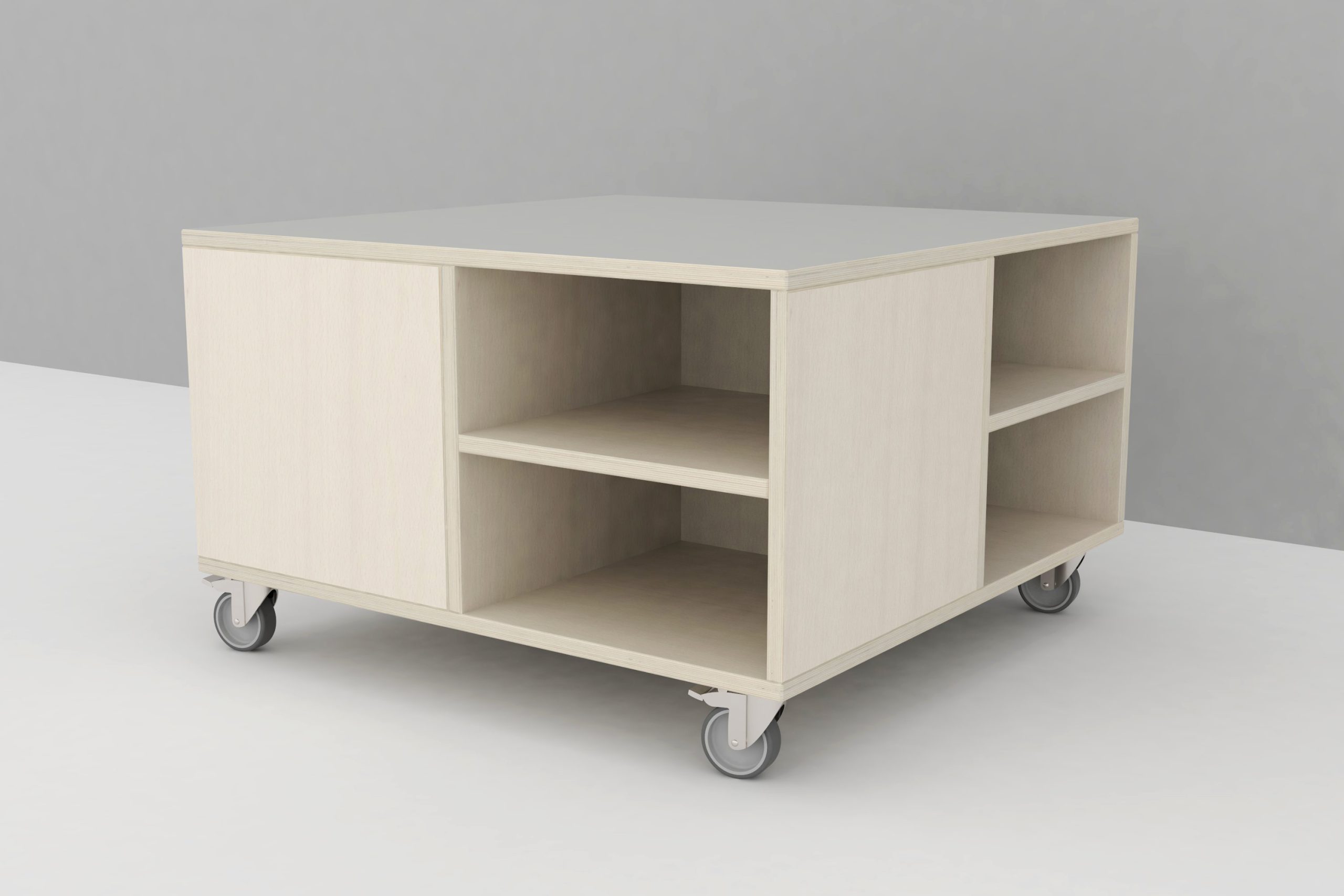 Mobile play table with 8 compartments is suitable for play, storage and creative activities further down to the ground, where children can easily reach.