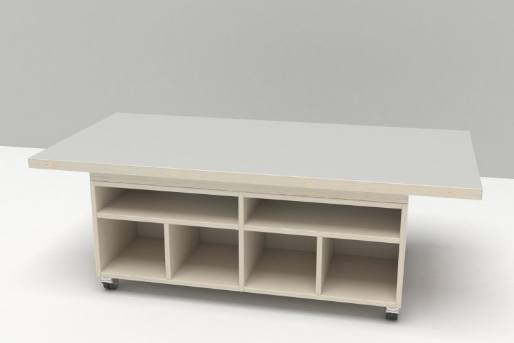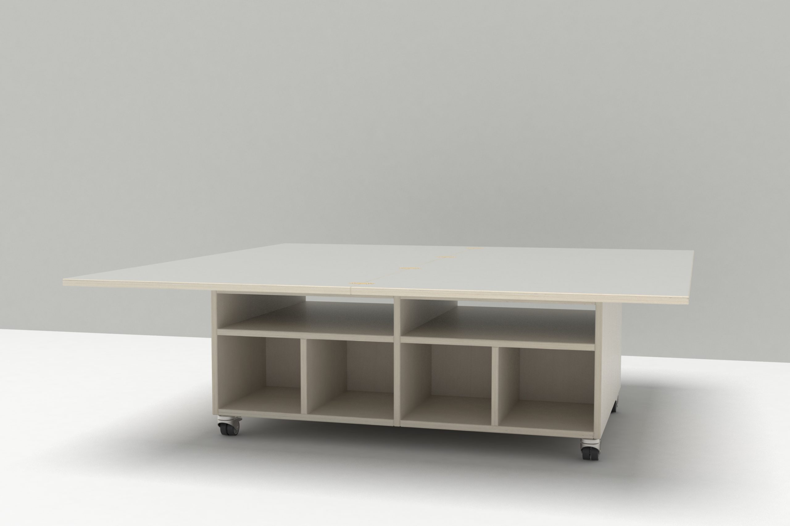 Mobile workbench with the option of 8 storage boxes. The table can be folded out into a huge workbench, so many people can play and work around it at the same time.
