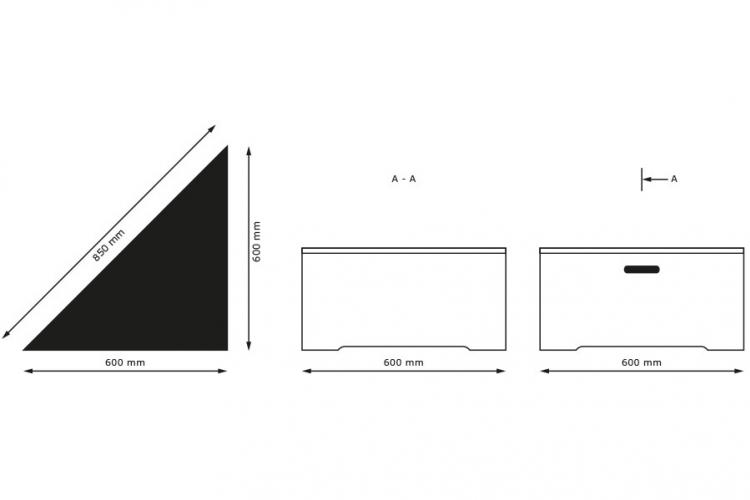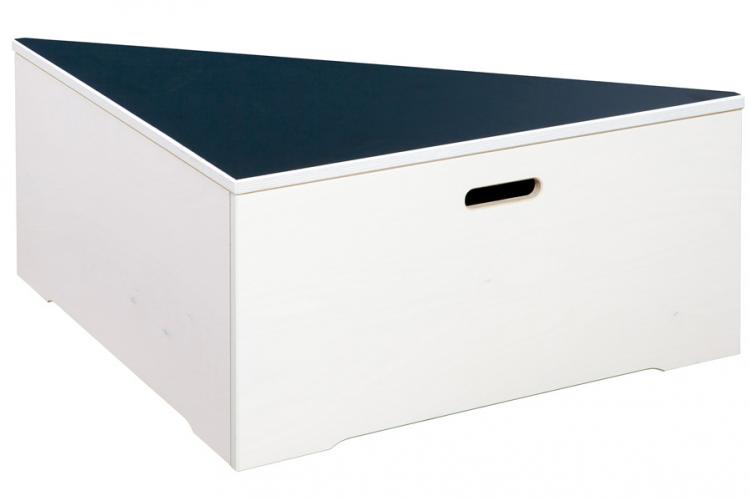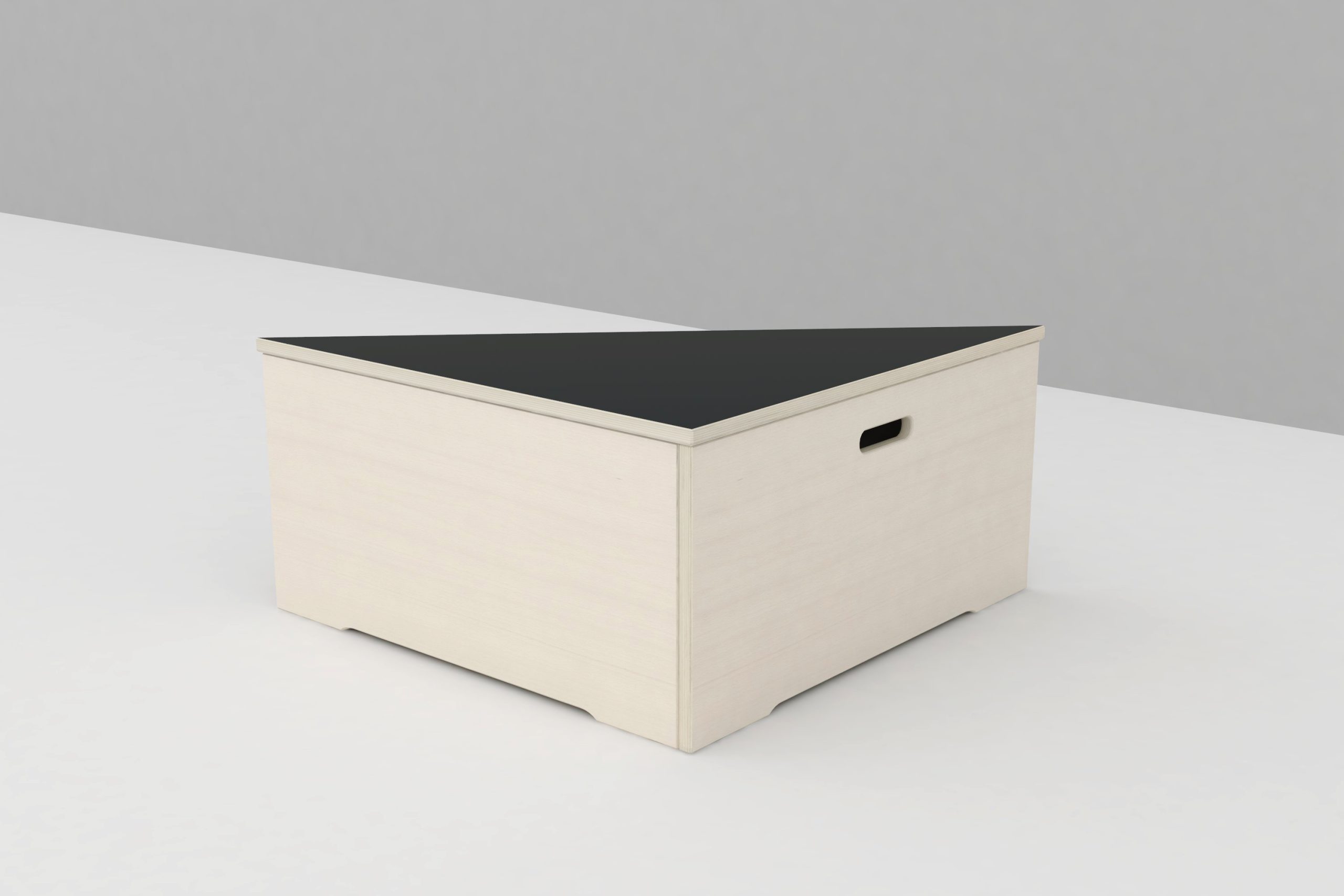 Triangular stage box in 15mm white-pigmented birch plywood with durable black laminate on top.