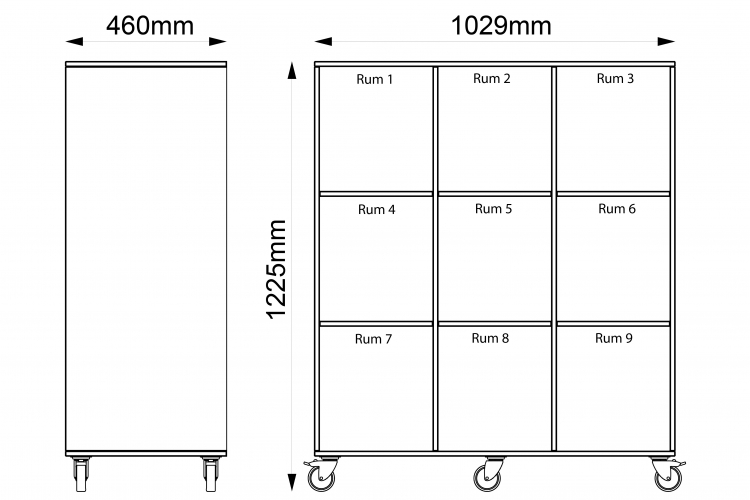 Mobile shelving unit with 9 compartments in 15mm white-pigmented birch plywood.