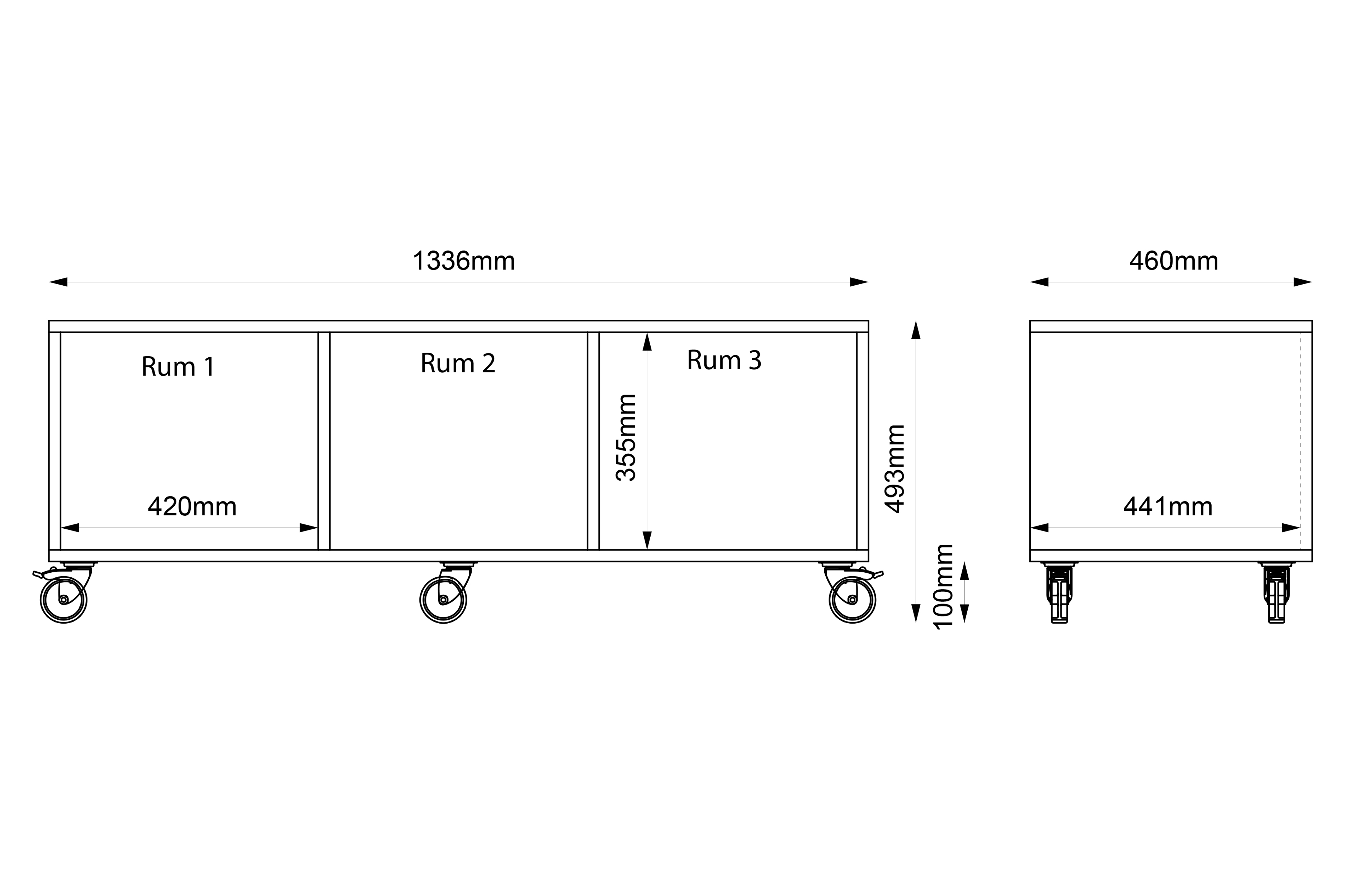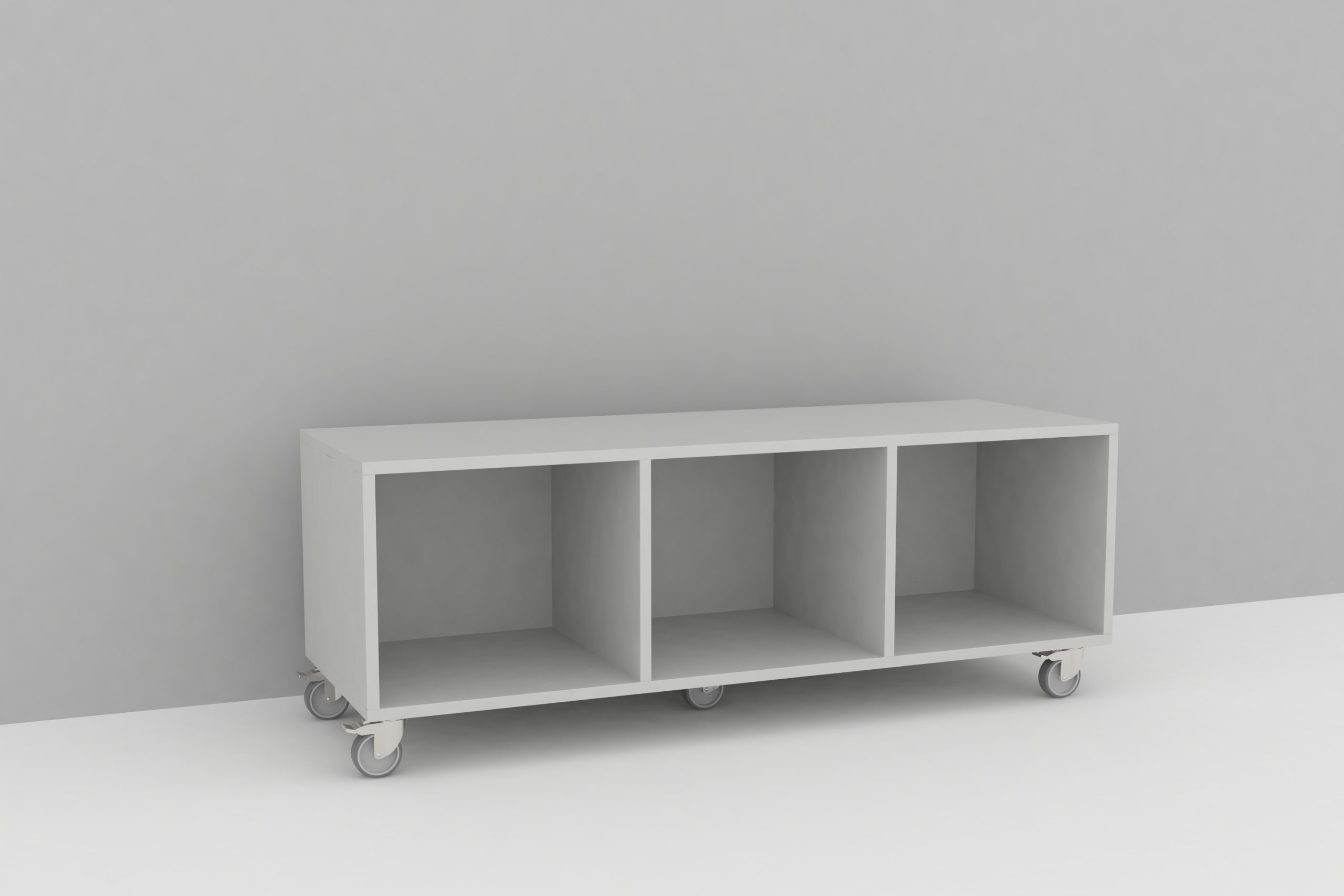 Mobiele kast met 3 vakken in 19 mm spaanplaat.