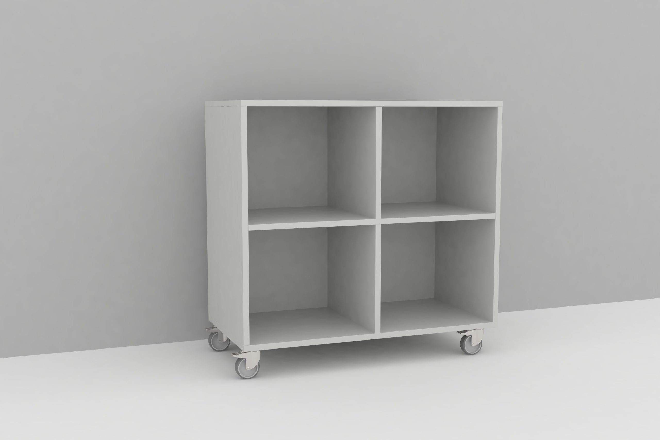 Mobiele kast met 4 vakken in 19 mm spaanplaat.