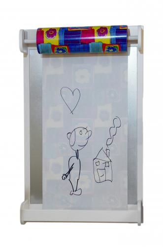 Wand-ezel met metalen plaat, vervaardigd uit 15 mm dik wit gepigmenteerd berkenmultiplex, met ruimte voor een papierrol.