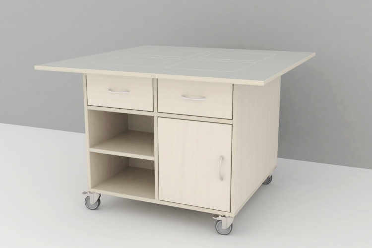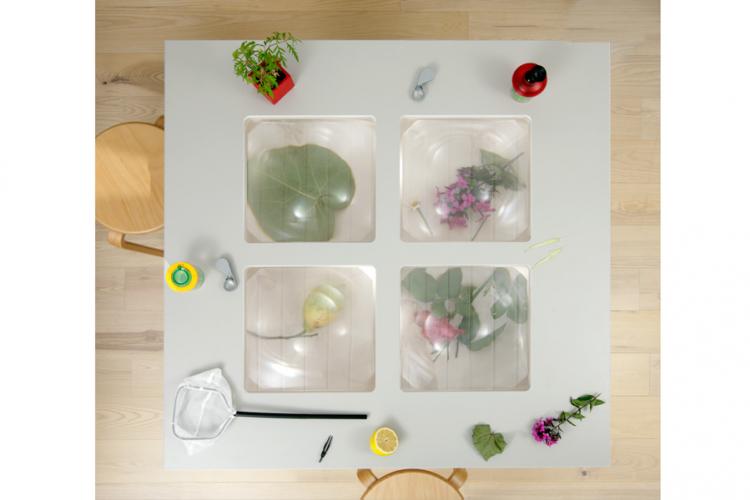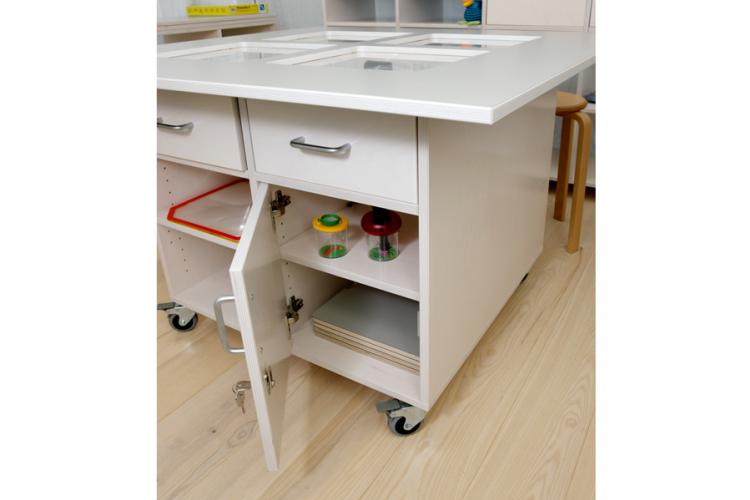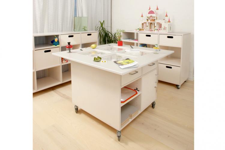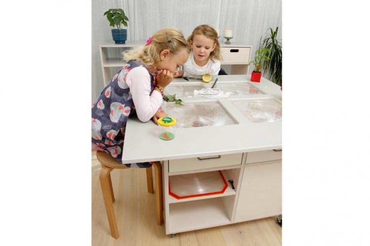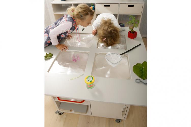 Mobil och multifunktionell nanotabel med optiska linser. Avtagbara skivor gör det möjligt att använda bordet till olika funktioner och aktiviteter - lek, kreativitet, ätande, förvaring och andra sysslor. De optiska linserna låter barnet utforska och undersöka saker på närmare avstånd.