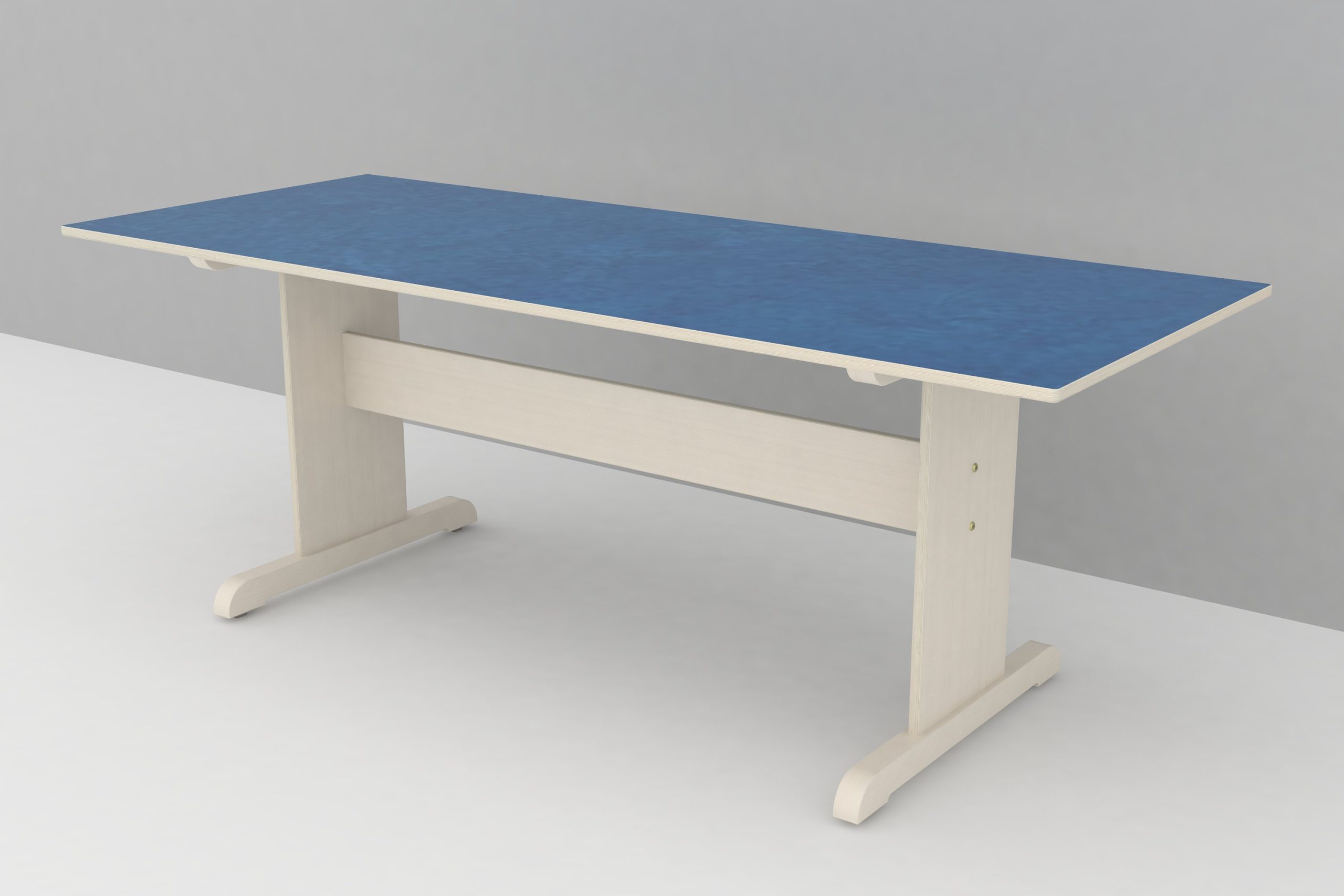 Bord i 18 mm vitpigmenterad björkplywood med ljuddämpande linoleum ovanpå.