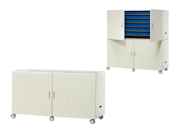 Madrasskab i 18mm hvidpigmenteret birkelaminat med plads til 7 madrasser inkl. hjul.